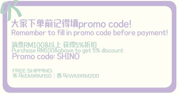 WELCOME TO SHINO! GET 5% DISCOUNT FOR THOSE WHO PURCHASE RM100 AND ABOVE!! USE PROMO CODE “SHINO”!